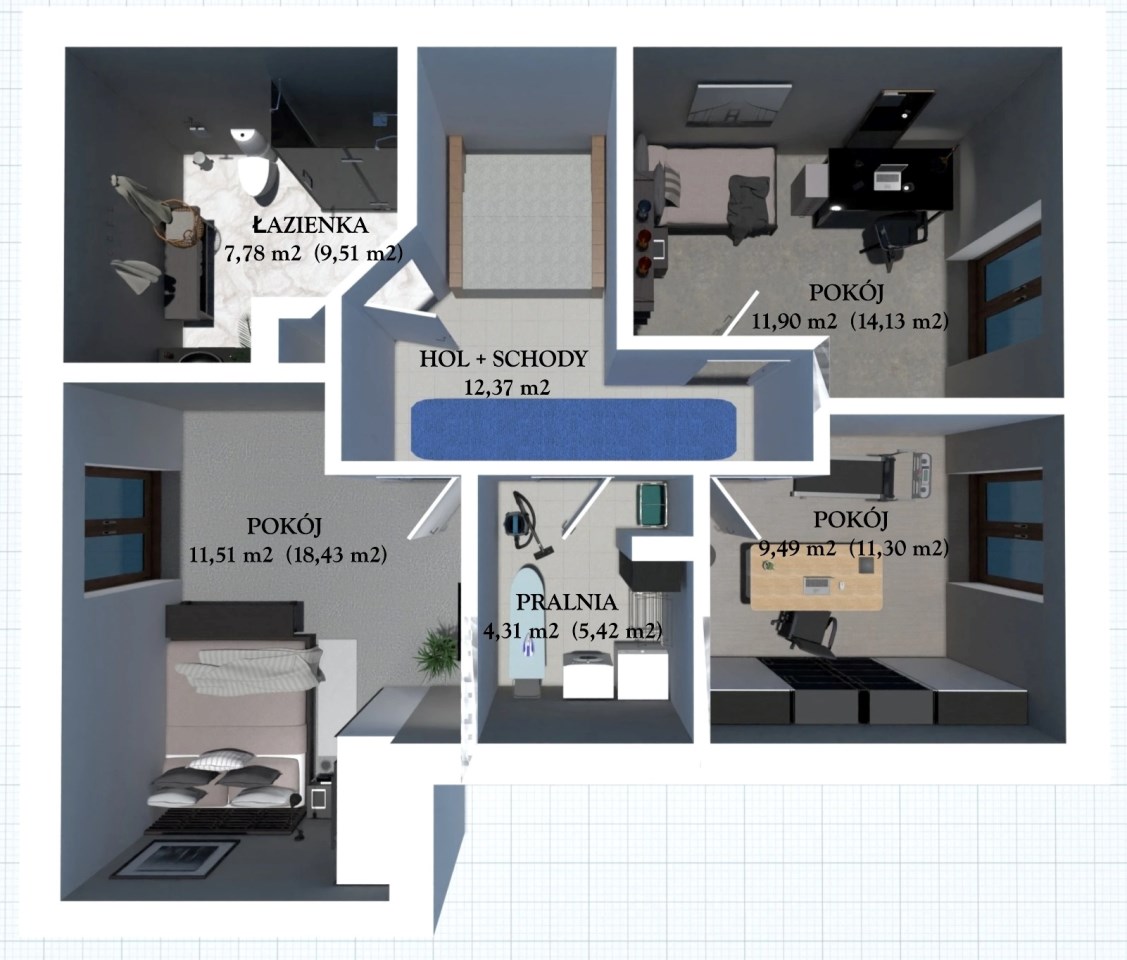 - łazienka – 7,78 m² pow. użytkowej (9,51 m² pow. podłóg)