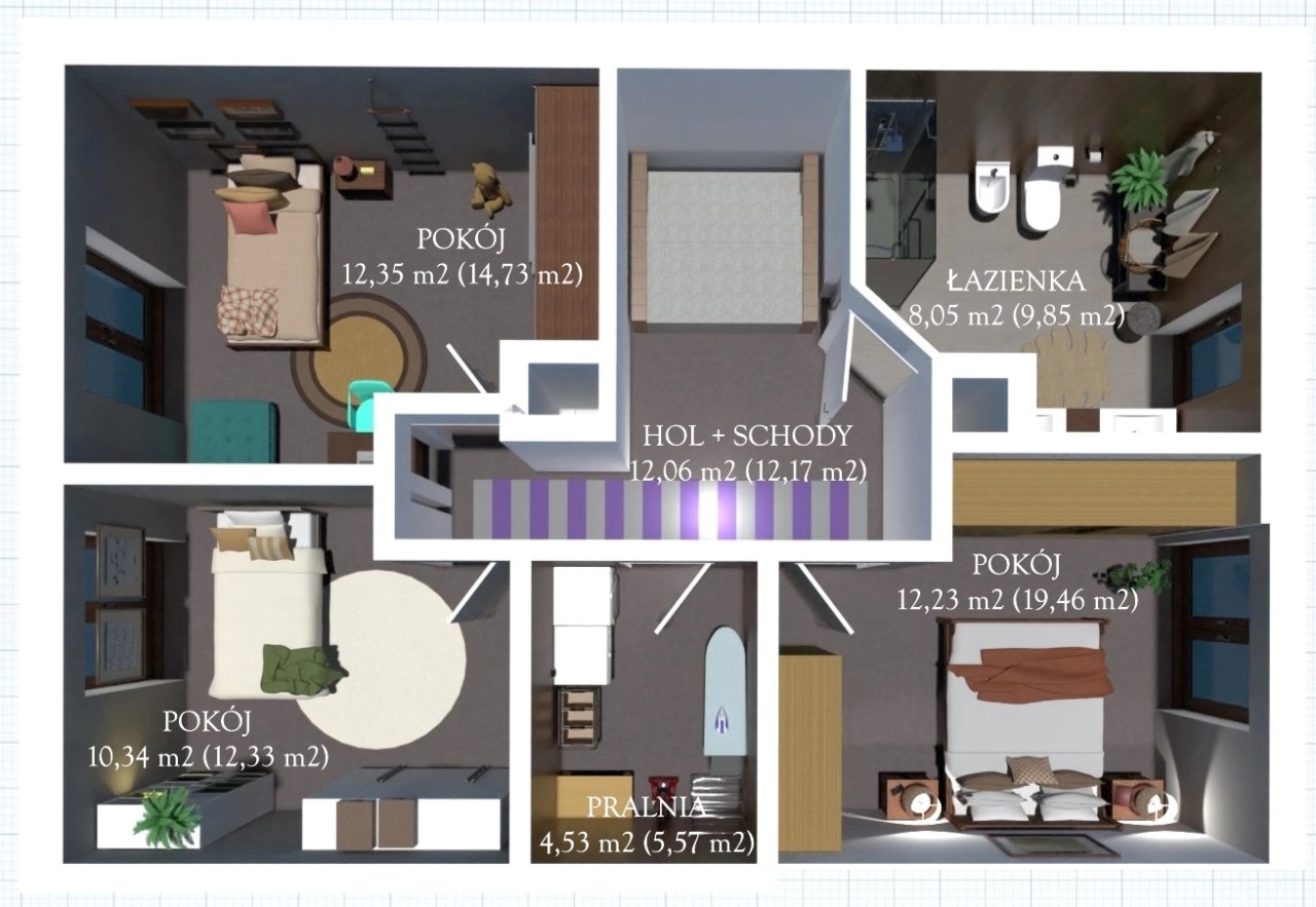 - hol i schody – 12,06 m² pow. użytkowej (12,17 m² pow. podłóg)