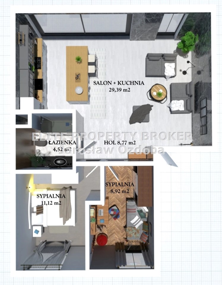 - salonu z aneksem kuchennym – 29,39 m²