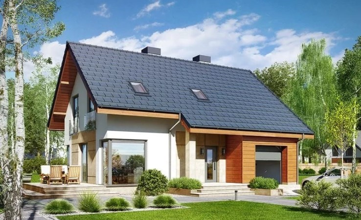 Dom jest dwupoziomowy o bardzo dobrze zaplanowanym rozkładzie pomieszczeń, który zapewnia wyraźny podział na strefę dzienną i prywatną. Dzięki dużym przeszkleniom dom jest jasny i dobrze doświetlony.