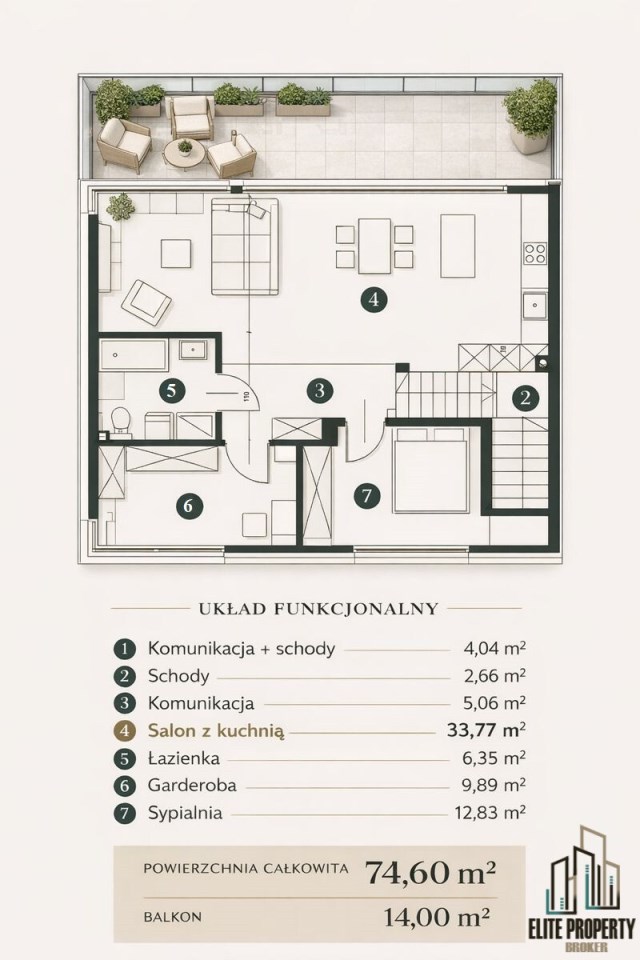 Przestronny salon z kuchnią stanowi naturalne centrum mieszkania i oferuje bezpośrednie wyjście na 14-metrowy balkon, który znacząco podnosi komfort codziennego użytkowania i stanowi doskonałą przestrzeń do wypoczynku.